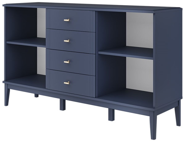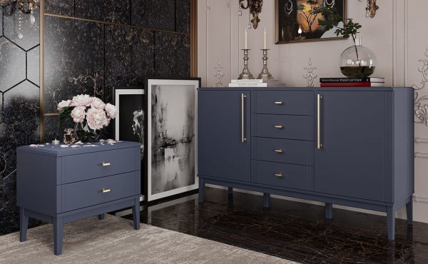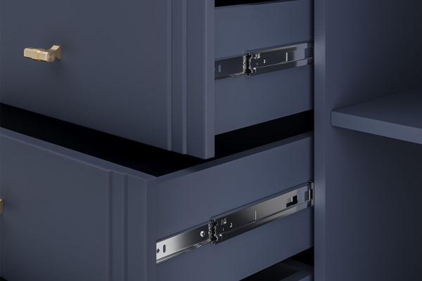 Комод  Джали - это стильное и функциональное дополнение для вашего интерьера. Габаритные размеры комода составляют 148х89х44 см. Фасад и крышка выполнены из МДФ в цвете Тёмный лазурный, а корпус из ЛДСП в цвете Ночное небо, что придаёт комоду современный и элегантный вид. Комод оснащён направляющими шариковыми полного выдвижения, обеспечивающими лёгкий и плавный доступ к содержимому ящиков. Петли с доводчиками гарантируют бесшумное закрытие. Опоры из массива в цвете Тёмный лазурный добавляют устойчивость и изысканность конструкции.