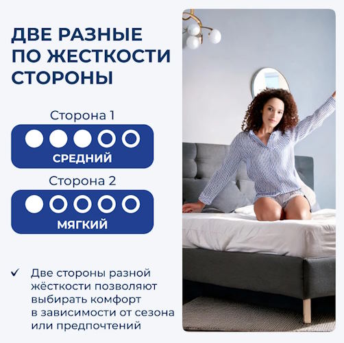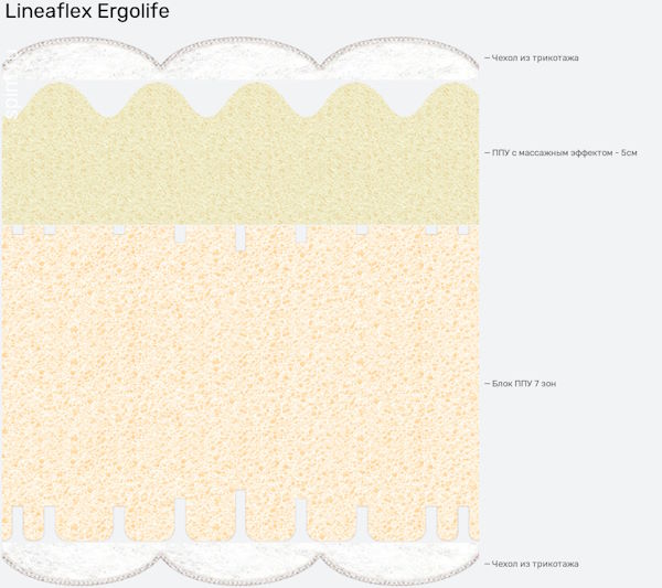 Первый слой высотой в 5 см – Soft-Massage. Предоставляющий желаемый комфорт людям, предпочитающим пружинистые, но мягкие матрасы. Второй слой – орто-пена ERGOFLEX, идеальная структура которая позволяет поддерживать наилучшую температуру и влажность. В комплект также входит чехол CLASSICO сделанный из текстильного материала, преимуществом которого является долговечность. Стежка – 300 грамм гигроскопичного файбера.