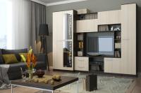 - Гостиная состоит из трёх модулей (шкаф платяной, шкаф бельевой, средняя секция), которые при желании можно устанавливать отдельно друг от друга, размещая в разных комнатах
